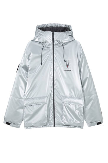 low temperatures, filled with down or synthetic fiber, often having a fur-lined hood, making them perfect for